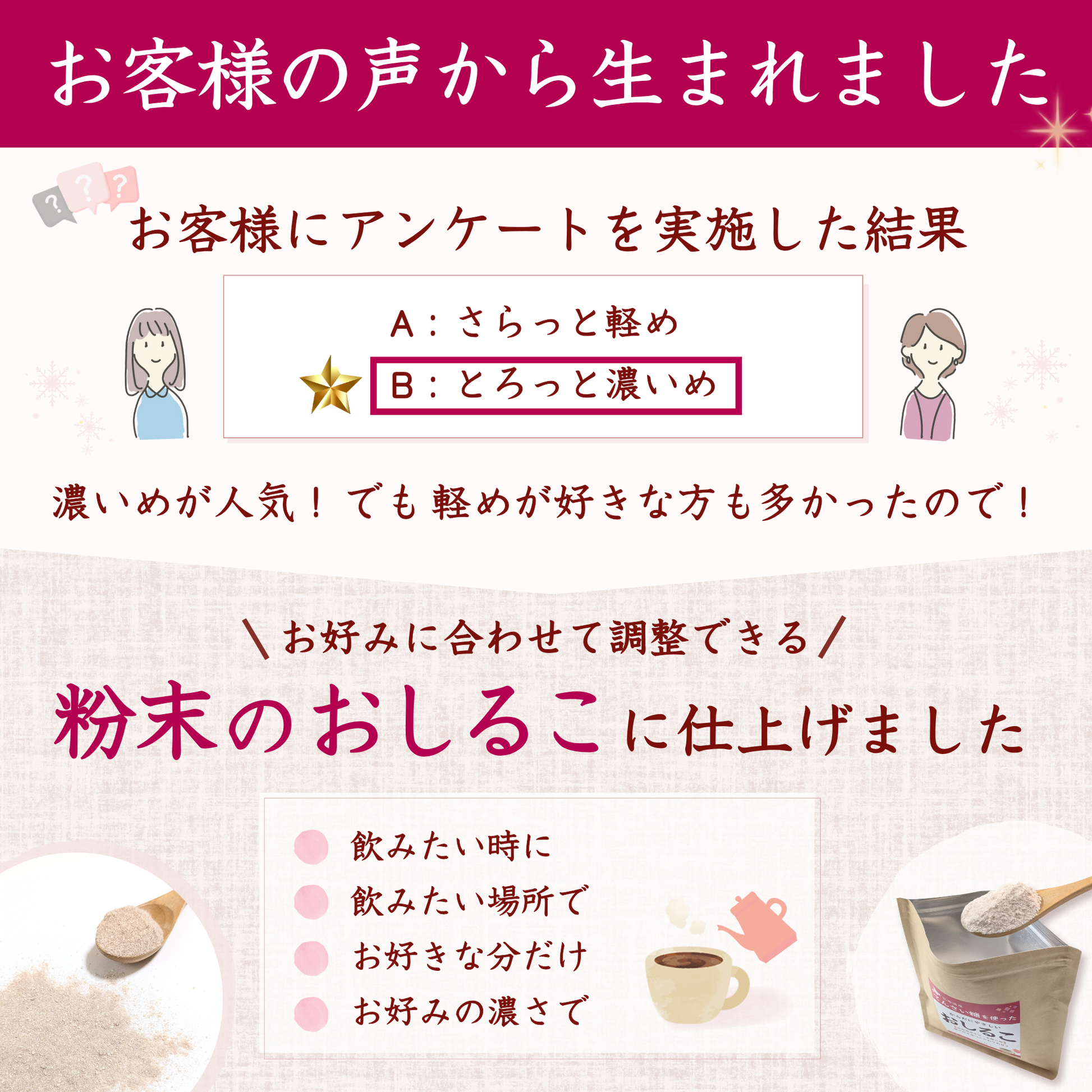 - 【ギフトや常備にも最適】 180gの粉末が入っており、必要量だけ作れるので家族それぞれの好みに合わせて楽しめます。来客時のお茶菓子としてもぴったりで、おしるこ・ぜんざいを手軽に楽しめる一袋です。
