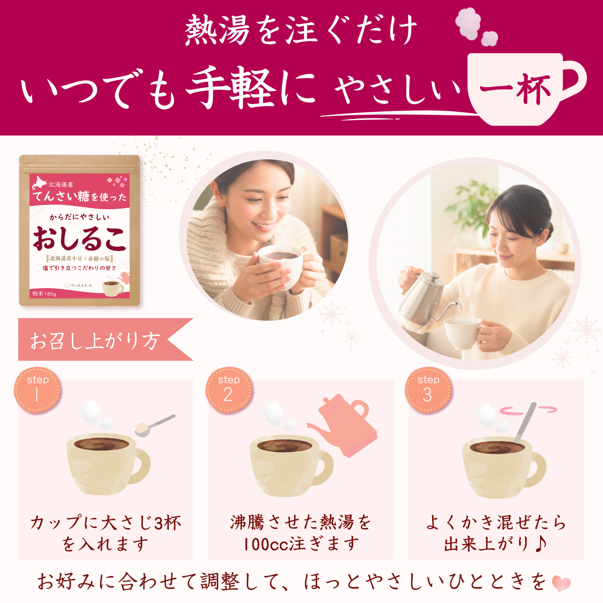 ウェルスイート おしるこ 粉末 てんさい糖×北海道小豆 赤穂の塩で引き立つやさしい甘さ お汁粉 180g
